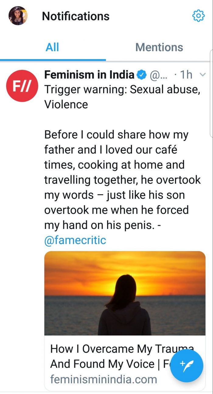 I am honoured to share that Feminism in India (FII) just published my op-ed essay – incredibly proud of the Delhi-based women’s magazine that takes actions and gives voices to violent issues within and beyond India. My huge thanks go to the editorial team for publishing this critical piece. I also received supportive thoughts from Mumbai Press Club at a time when actress Tanushree Dutta started the #MeToo Movement in India. The highlighted section (below) is one of the posts that FII tweeted. You can read the complete article here https://feminisminindia.com/2019/02/01/overcame-trauma-found-voice/